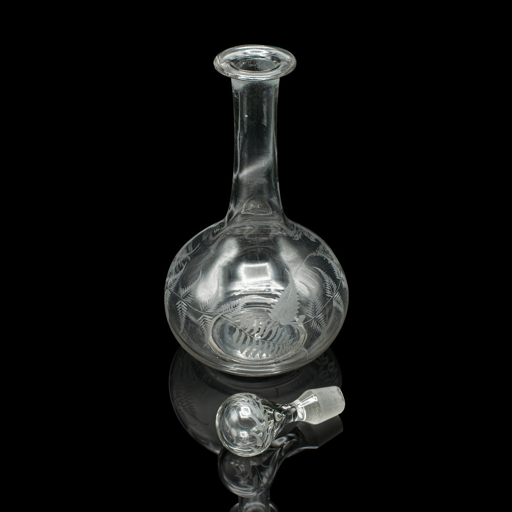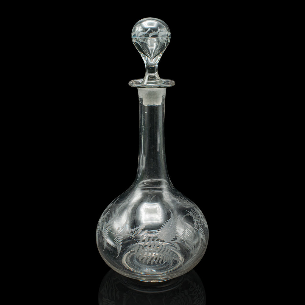 - Finely etched decoration adorns the bulbed body and stopper, featuring a fern leaf pattern of delicate artistry